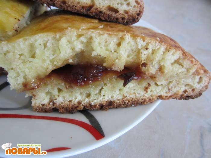 Сверху накрываем другой половинкой теста и соединяем края. Поверхность пирога смазываем взбитым желтком.