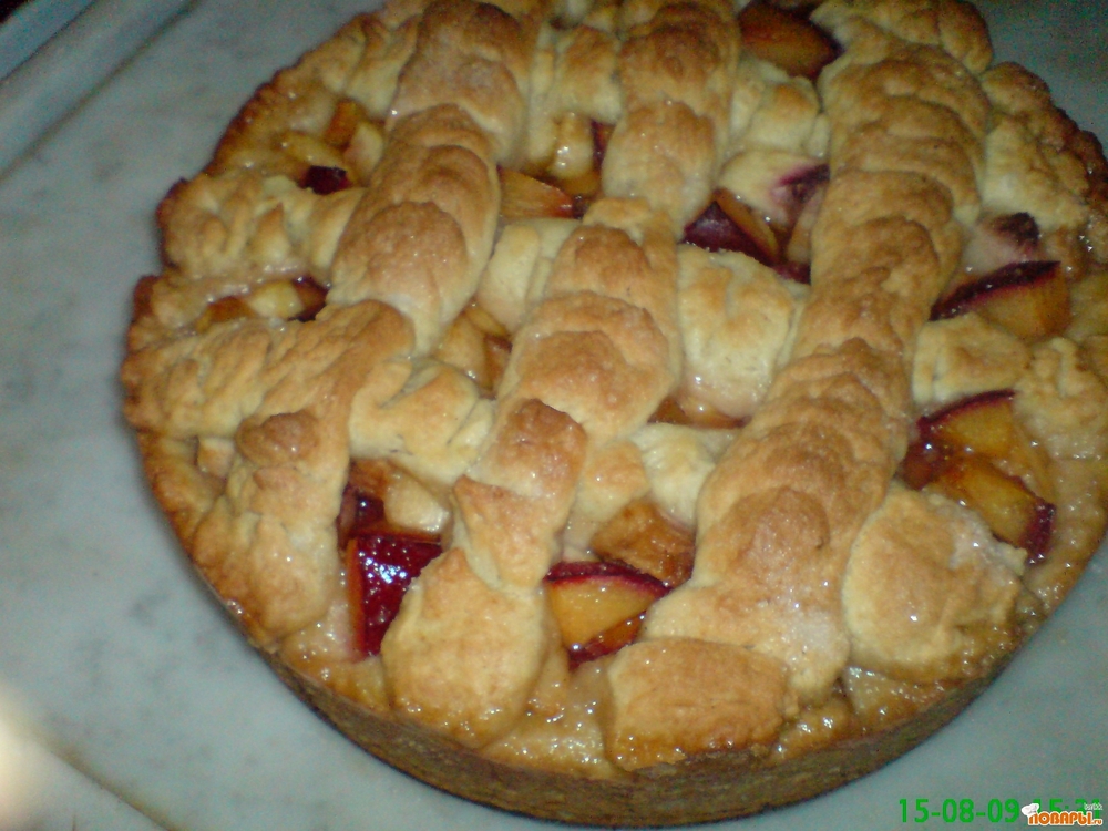 У персиков снять кожуру.Нарезать кубиками персики и сливы. Перемешать и разложить по тесту.Присыпать немного сахаром. Пирог можно оставить открытым,а можно выложить сетку или сделать как нибудь по вкусу.