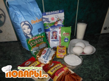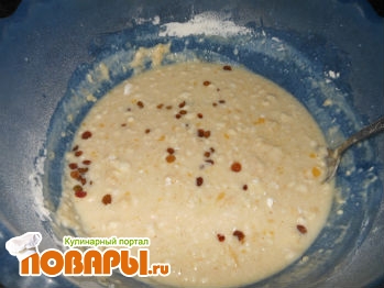 Молочную смесь вылить в миску, добавить поднявшиеся дрожжи, яичную смесь, все хорошо перемешать. Жиры добавляем в последнюю очередь: выливаем растопленный маргарин. Хорошо все перемешиваем и начинаем всыпать муку частями. Добавить изюм.