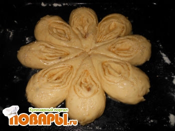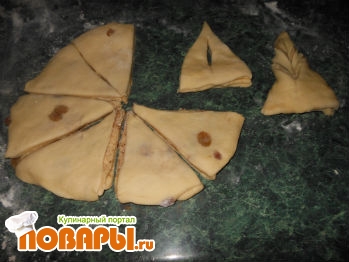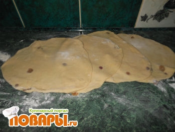 Пироги делаются таким образом: раскатать 4 небольшие лепешки, смазать и посыпать между собой (кроме верхней) растительным маслом и сахаром соответственно.