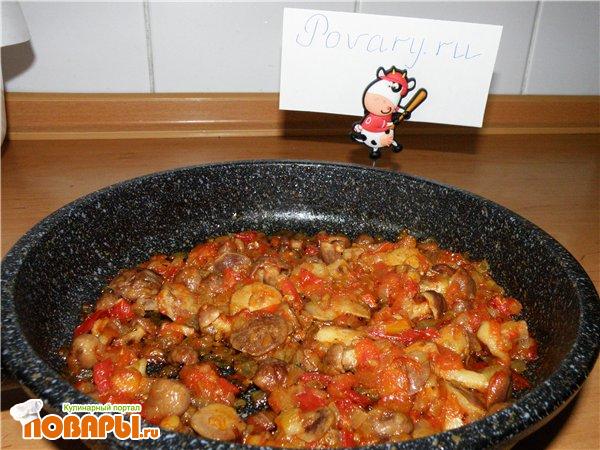 Грибной соус: лук режем кубиками и отправляем на сковородку томиться на растительном масле, подготавливаем грибы и добавляем их к луку. Минут через пять туда же кладем резанные кубиками помидоры. Не забыть посолить по вкусу.