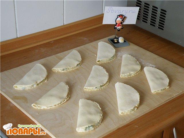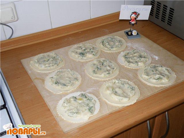 Раскатать тонко тесто, вырезать кружочки диаметром 10-12см, вместо шаблона я использовала небольшой салатник. Равномерно, высотой примерно 1 см выложить пюре