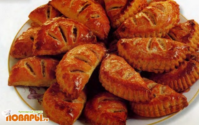 На посыпанном мукой рабочем столе раскатайте тесто в лист, вырежьте формочкой множество кружков. Разложите по ним яблочную начинку, взбейте вилкой яйцо и смажьте края кружков. Сложите вдвое и скрепите тесто.