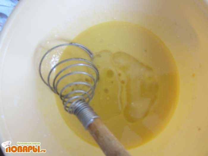 Делаем дрожжевое тесто. Для этого в теплую сыроватку добавляем сухие дрожжи, сахар, ванильный сахар, подсолнечное масло и одно яйцо. Все аккуратно перемешиваем до получения однородной смеси.