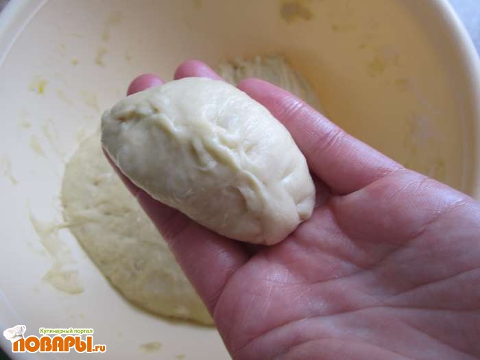 Дальше постепенно добавляем муку. Все хорошенько смешиваем и делаем густое тесто. Тесто необходимо отставить пару раз на некоторое время, чтобы оно подошло. Когда тесто будет готово, можно лепить пирожки: отрываем немного теста, делаем лепешку, в серединку добавляем ложку повидла.