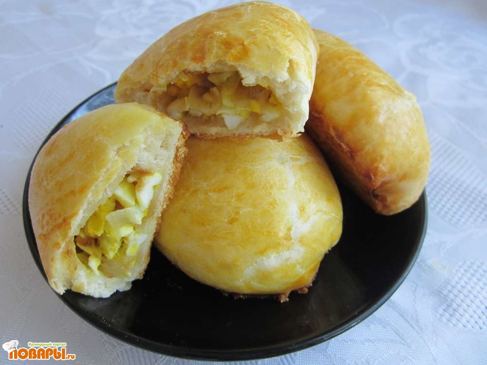 Руки смазываем растительным маслом и лепим пирожки с начинкой из яйца и лука. Смазываем сверху взбитым яичным желтком. Выпекаем пирожки при температуре 180-200 градусов до тех пор, пока они не станут румяными.