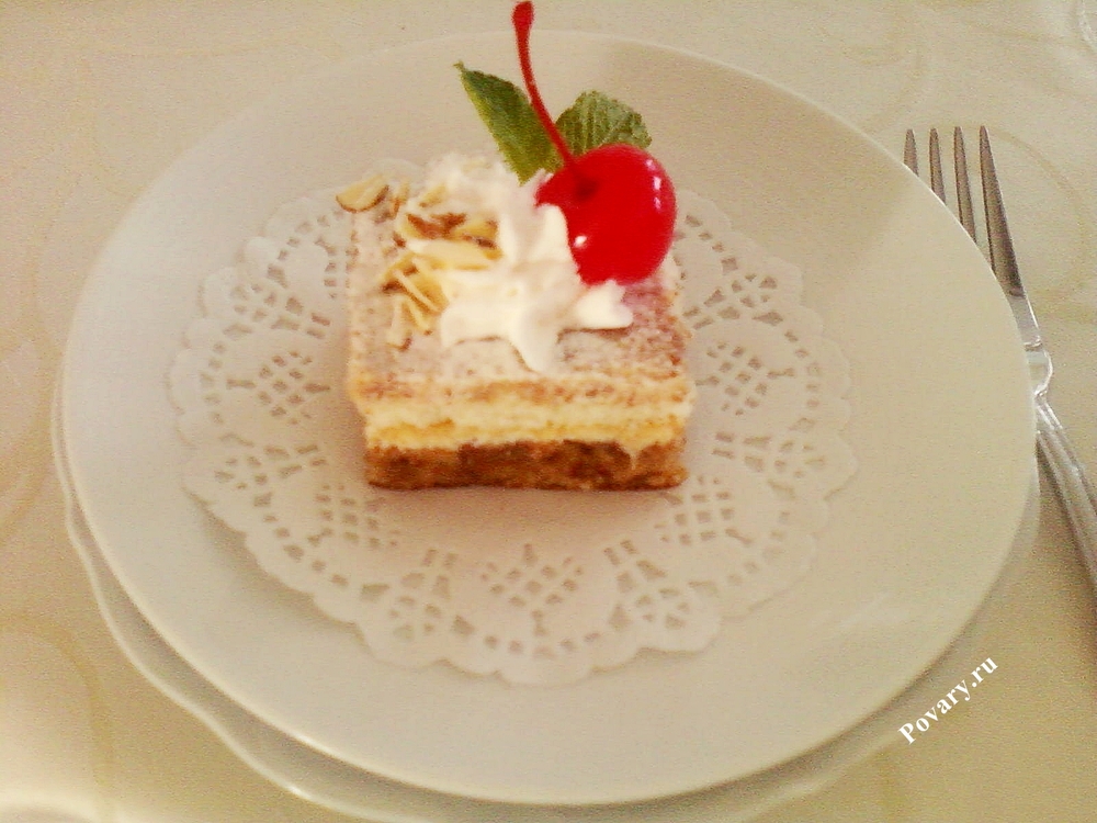 Последний штрих: готовый полуфабрикат разрезать на порции в виде квадратов или прямоугольных, треугольных фигурок, отсадить на поверхность каждого пирожного взбитые сливки, посыпать миндальными пластинами, и декоративной сахарной пудрой, уложить 1 коктейльную вишню с веточкой на 1 изделие.