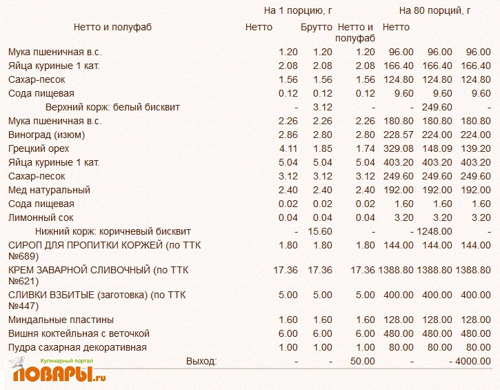 выработка нижнего темного коржа: взбить яйца, постепенно добавляя сахар; · взбитые яйца с сахаром перемешать с подготовленной мукой, изюмом, ядрами орехов, медом, добавить погашенную лимонным соком соду, полученную массу слегка перемешать до получения однородной консистенции, оставить для остывания на холоде; · смазать подсолнечным маслом тару для выпекания, налить тесто, выпечь в ПКТ с помощью режима «конвекция» при температуре 200°С в течение 25-30 минут.
