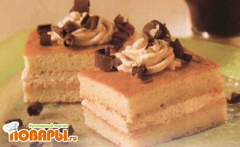Для крема сливки взбейте с сахарной пудрой и кофе. Бисквит разрежьте горизонтально пополам, чтобы получилось 2 коржа. Нижний корж смажьте кремом, оставив часть для оформления, накройте верхним коржом, разрежьте на небольшие квадраты или прямоугольники. Оформите пирожные оставшимся кремом и шоколадной стружкой.
