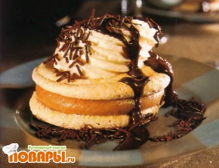 Приготовьте шоколадный соус. Положите на каждую тарелку шарик каштанового мусса величиной с лесной орех, чтобы прикрепить к ней первый диск безе. Затем покройте его слоем каштанового мусса толщиной 2 см. Разместите сверху второй диск безе. Влейте в миску 400 мл сливок, добавьте сахар по вкусу и взбейте веничком. Украсьте сверху каждое пирожное розочкой из взбитых сливок, используя для этого кондитерский мешок с зубчатой насадкой диаметром 8 мм. Перед подачей разогрейте на водяной бане шоколадный соус и перелейте его в соусник. Можно также украсить каждое пирожное соусом и шоколадной посыпкой.