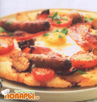 Топпингом для этой пиццы служат компоненты английского завтрака: яйца, бекон, сосиски, грибы. Блюдо очень сытное, поэтому его можно использовать в качестве основного и за обедом.