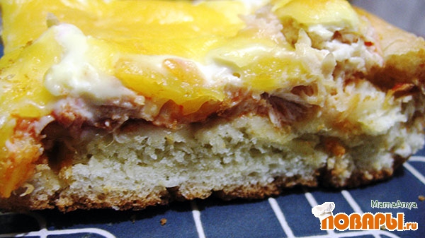 Замесить дрожжевое тесто (я это делаю в хлебопечке), оставить в теплом месте на полчаса - час. Отварить куриное филе, нарезать мелкими кубиками. Когда тесто подойдет, сделать лепешку по размеру формы для выпечки.
