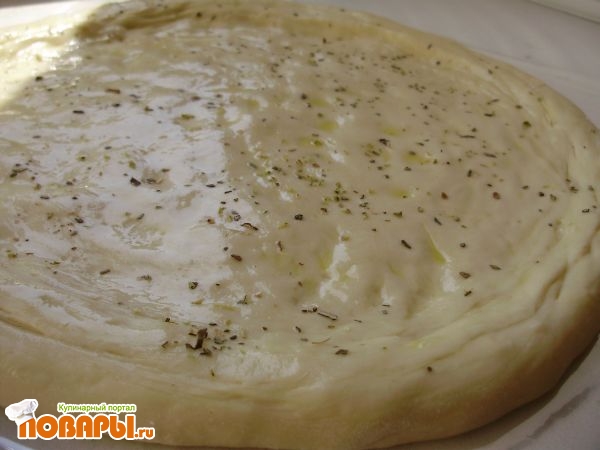 Тесто раскатываем, делаем бортик, смазываем оливковым маслицем, посыпаем орегано.