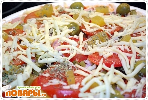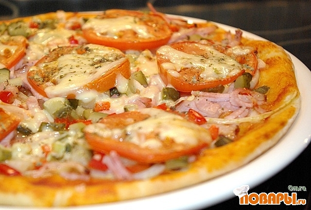 У меня ветчина, сосиски, сладкий красный перец, кисло-сладкие маринованные огурцы, маринованная в яблочном соке тыква, помидоры, сыр, оливки и приправа для пиццы.