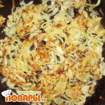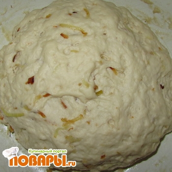 После чего в подошедшее тесто вмешиваем обжаренный лук с маслом, на котором он жарился и еще раз даём тесту подойти.