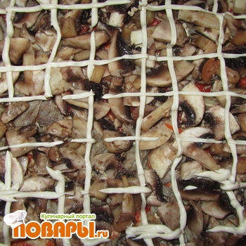 смазываем томатным морсом, выкладываем кусочки мяса, слой порезанных шампиньонов, поливаем майонезом.