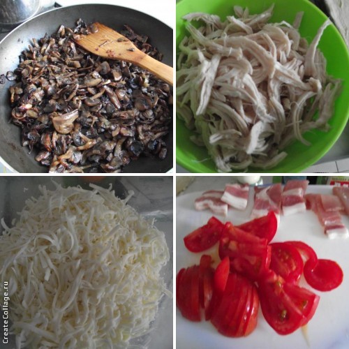 Сверху положите кусочки бекона, отваренного куриного филе, жаренные грибы, нарезанные помидоры, по желанию можно добавить зелень и конечно же обильно посыпать тертым сыром.