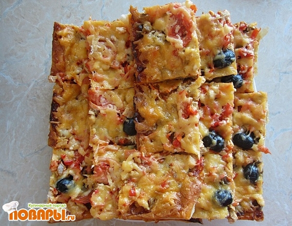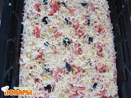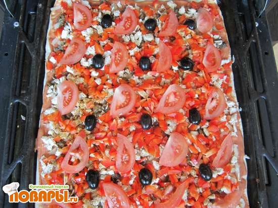 Потом выкладываем следующий слой из нарезаного болгарского перца и сверху делаем сеточку из майонеза. Берем помидор, режим его кружочками или полукружочками и выкладываем его сверху. Далее берем маслины и тоже выкладываем возле кусочков помидора.