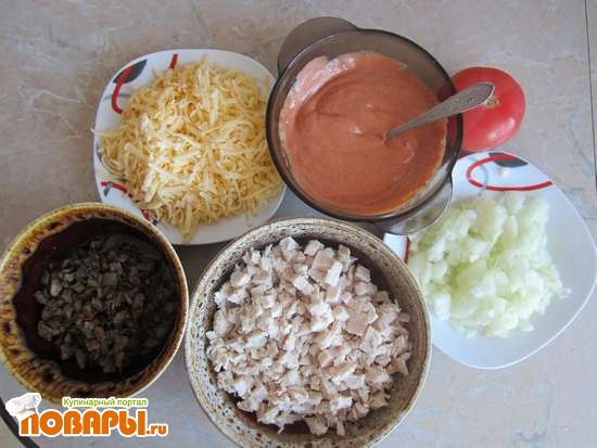 Куриное филе необходимо отварить, подождать пока остынет и нарезать небольшими кусочками. Берем болгарский перец, моем и тоже нарезаем. Твердый сыр натираем на крупной терке.