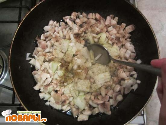 Для начала необходимо приготовить начинку. Берем грибы, чистим их и нарезаем небольшими кусочками. Чистим лук и тоже нарезаем его небольшими кусочками. Далее грибы с луком обжариваем на сковородке, добавляем соль, перец по вкусу. Жарим грибы до тех пор, пока они не будут готовы.