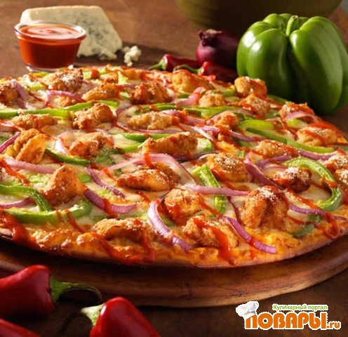 Выпекать пиццу при температуре 180—200°С до зарумянивания.