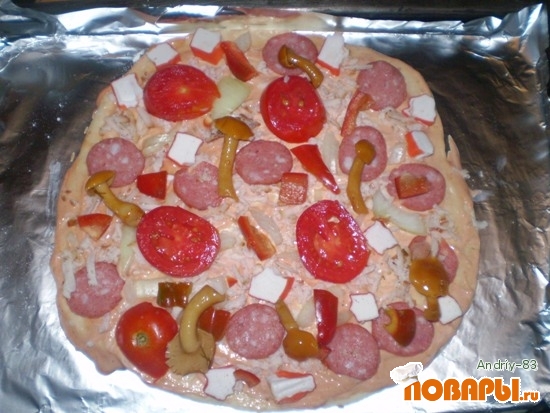 После того, как тесто подойдет можно начинать делать пиццу. Тесто раскатывать тонко, корж перемазать майонезом и кетчупом, притом майонеза чем больше тем лучше, выложить все ингредиенты и печь до получения золотистого цвета.