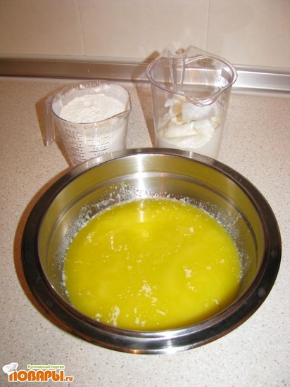 В кастрюльку или миску выливаем сливочное растопленное теплое масло, добавляем сметану (200 грамм) и высыпаем по чуть-чуть муку. Хорошо перемешиваем и ставим в холодильник 30 - 60 минут.