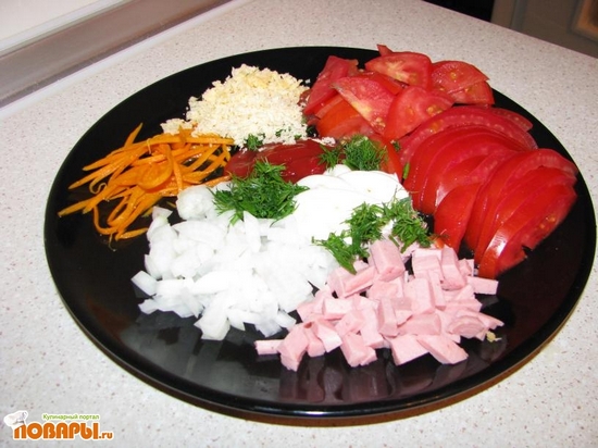 Готовим начинку. Нарезаем колбасу или ветчину,помидоры (1-2 штуки), лук репчатый (1 штука),натрем на терке твердый сыр, режим зелень, можно добавить корейской морковки.