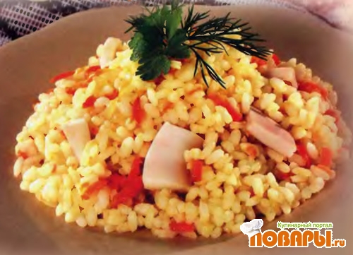 Соедините рис с овощами и кальмарами, добавьте соль, перец, воду и тушите в духовке до готовности риса.