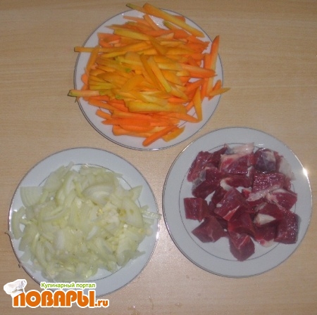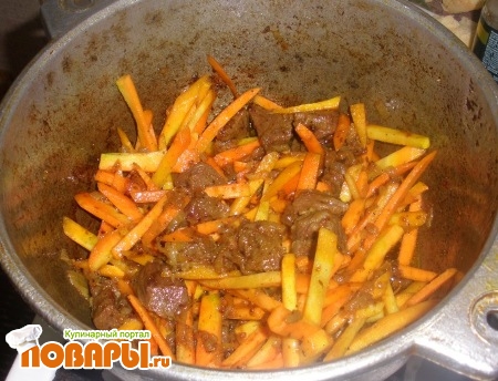 Разогреть растительное масло в казане или в кастрюле с двойным дном, запустить лук и обжаривать до золотистого цвета. Затем запустить в него мясо со всеми специями, посолить и жарить, помешивая. Через 15 минут добавить морковь и жарить ещё 15 минут.