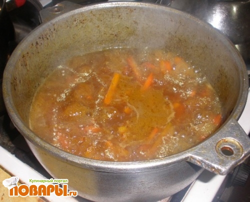 Когда морковь поджарится, залить водой на 3-4 см выше, довести до кипения, накрыть крышкой и 20-30 минут выпаривать зирвак.