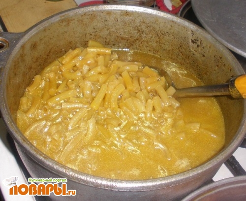 Когда мясо станет мягким, добавить сырых макарон и, если необходимо, добавить воды так, чтобы она прикрывала макароны. Довести до кипения и варить под крышкой до готовности.
