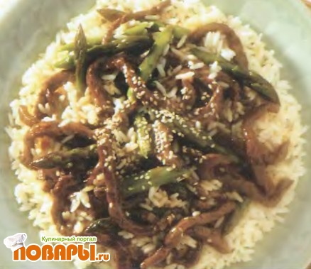 В этом изысканном блюде соевый соус и херес подчеркивают вкус спаржи и говядины. Можно использовать и мороженую спаржу, но в этом случае ее нужно взять немного меньше и предварительно разморозить.