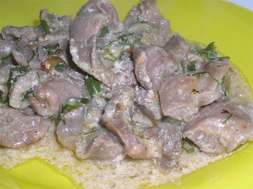 После добавить сметану, перемешать, она должна "растаять" и выделить масло. Подлить воды (чтоб покрывала желудки), слегка посолить(учитывая то что вода испарится) накрыть крышкой и тушить на хорошем огне минут 20-30.