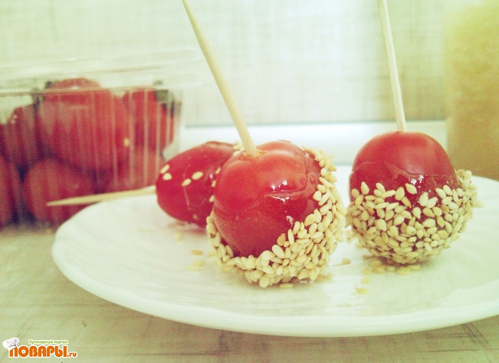 Теперь работаем очень быстро и аккуратно. Берем шпажку с помидоркой, обмакиваем в карамель, если капает, то пусть немного стечет. Теперь помидорку обмакиваем в кунжутную смесь. Ложим на место, где она будет остывать.