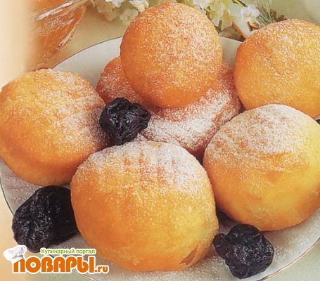 Сделать из теста лепешки, положить в середину измельченный чернослив, слепить края и сформировать пончики круглой формы.