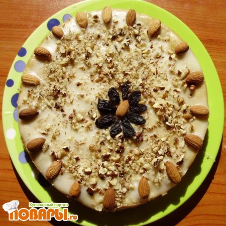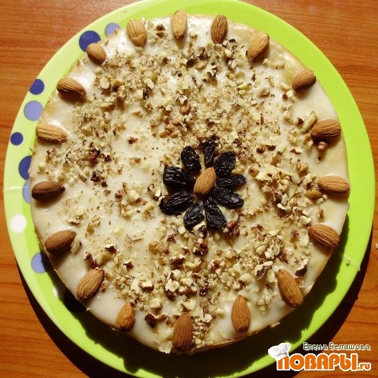 Вкусно еще, когда один из коржей с какао, а на верхний корж налить манный крем + растопленный черный шоколад. Важно масла для коржей не пожалеть и воды не перелить, чтобы потом «резину» не жевать (хотя съедобно). Орех грецкий можно прямо в коржах запекать или в манный крем кидать.