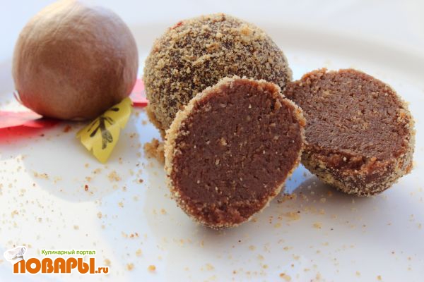 В крошиво вылила шоколадный крем, перемешала, накатала шариков, которые обваляла в печенькиных кусочках.