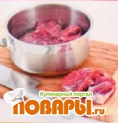 Грудинку вымыть, нарезать кусками средней величины, сложить в кастрюлю, залить холодной водой, чтобы она только покрывала мясо, посолить. Довести до кипения, снять пену, убавить огонь и варить около 1 часа.