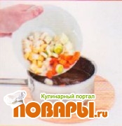 Добавить овощи в кастрюлю с мясом, варить ещё 30 минут. Посолить и поперчить по вкусу. Отдельно отварить вермишель, выложить на дно глубоких тарелок.