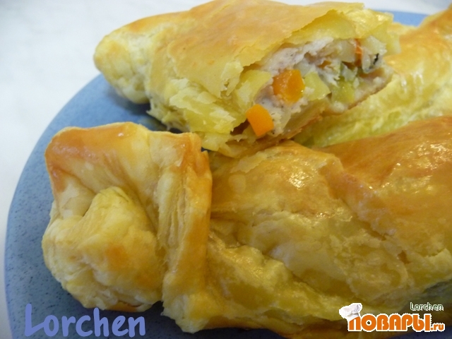 Раскатайте пластину теста в прямоугольник. Выложите начинку. Заверните начинку в тесто, так, чтобы она была полностью закрыта. Сожмите края теста, чтобы было похоже на «хлопушку».