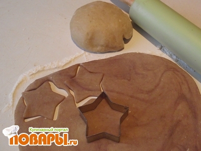 На присыпанной мукой поверхности раскатать тесто в пласт толщиной 0,5 см. Вырезать формочками печенье (можно сделать шаблоны для печенья из плотного картона и вырезать печенье по ним).