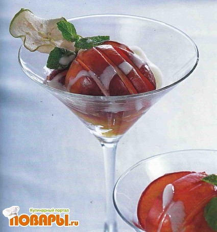 Смешайте йогурт с медом. Разложите горячие фрукты по тарелкам и полейте йогуртовой смесью. Сразу же подавайте.