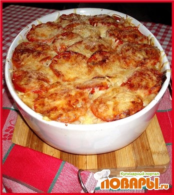 Разложить поверх макарон помидоры, нарезанные на секторы.