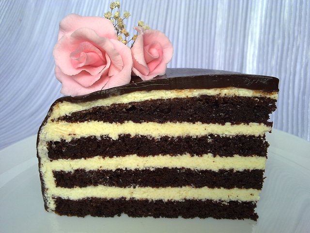 Торт хорошо переносит мастику и украшения из неё и может служить нижними-средними ярусами в многоэтажных тортах. Вкус напоминает конфеты Птичье молоко советских времён.