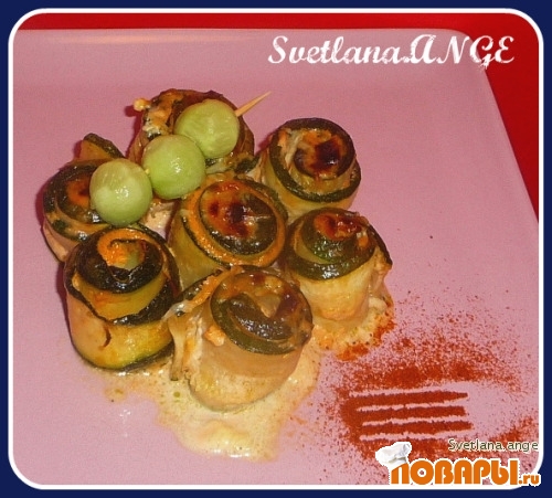 Сыр натереть на терке, смешать с мелко порубленным чесноком и майонезом. Этой смесью намазать не густо обжаренные ломтики цукини и скрутить их в рулетики.