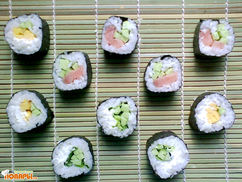 по центру нори горизонтально выкладываем начинку: для первой порции - творожный сыр, лист салата, нарезаный и очищенный огурец, 2-ая порция - огурец, нарезанный ломтиками лосось, 3-ья порция - сыр, омлет, огурец.