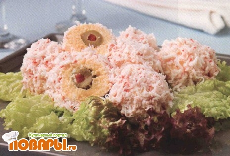 Запанируйте шарики в белково-крабовой смеси и охлаждайте не менее 30 минут.