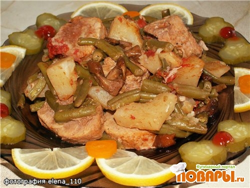 Потом добавить к мясу грибы, фасоль, порезанный кубиками картофель.