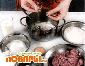 В небольшом количестве теплого молока растворить дрожжи с сахаром, добавить немного муки, тщательно перемешать и оставить опару подниматься.